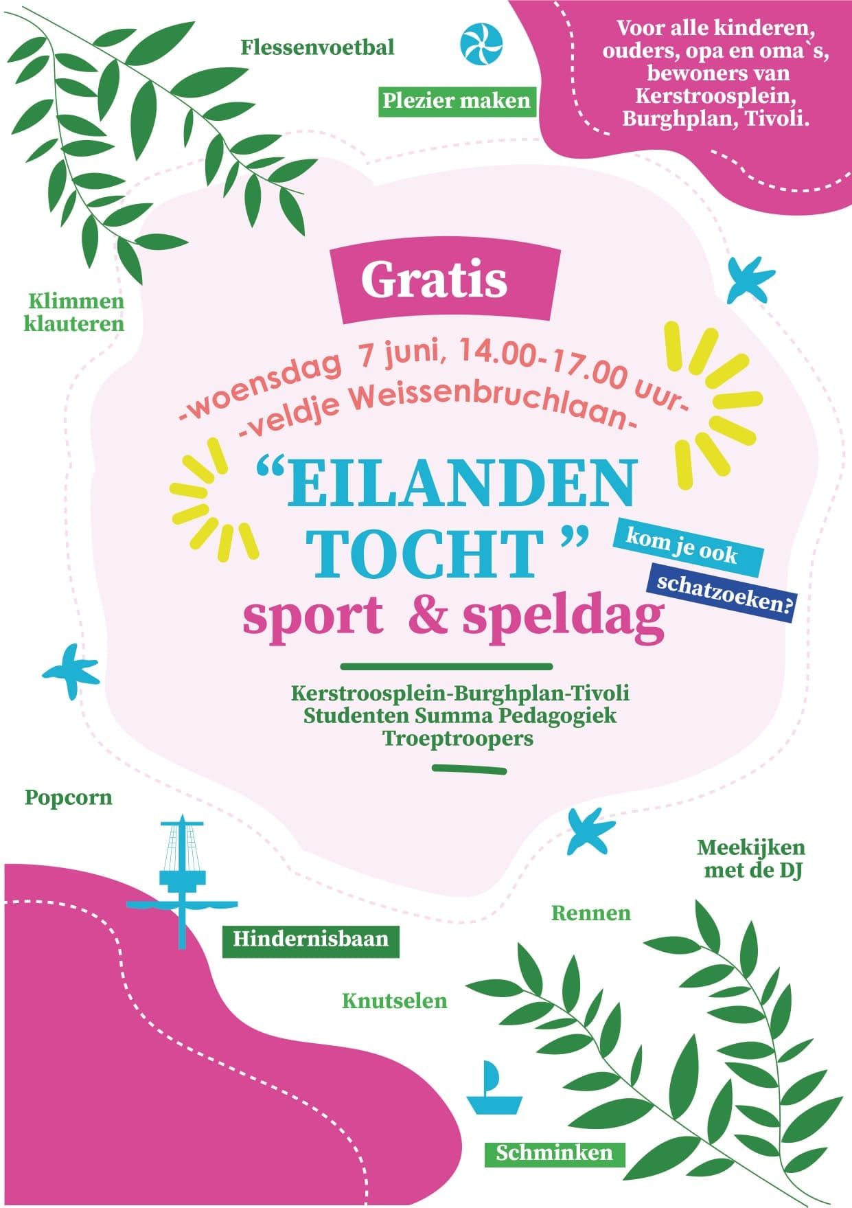 Een "eilandentocht" met allerlei sporten en spellen: klimmen, schatzoeken, hindernisbaan, knutselen en natuurlijk wat lekkers.