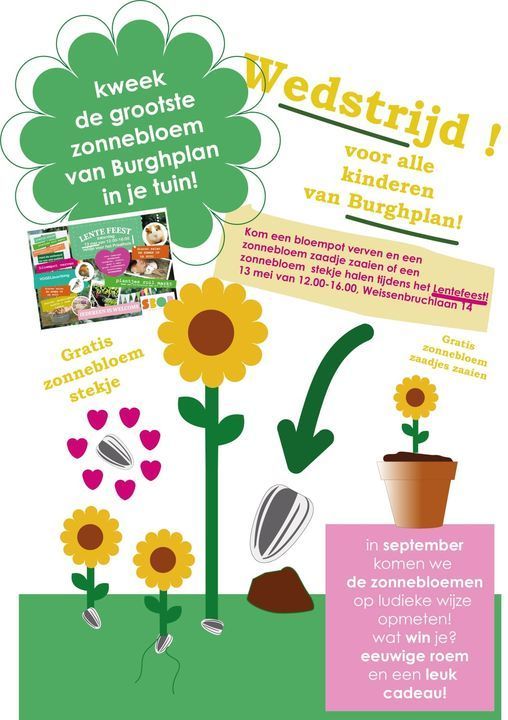 Tijdens het lentefeest kon je gratis zonnebloemzaadjes of -stekjes halen om in je tuin te zaaien/planten. De uitdaging was om de grootste zonnebloem van Burghplan in je tuin te kweken. De zonnebloemen werden in september op ludieke wijze opgemeten.