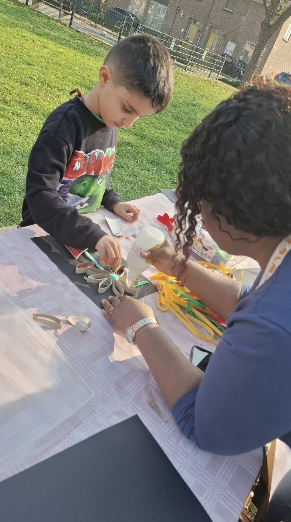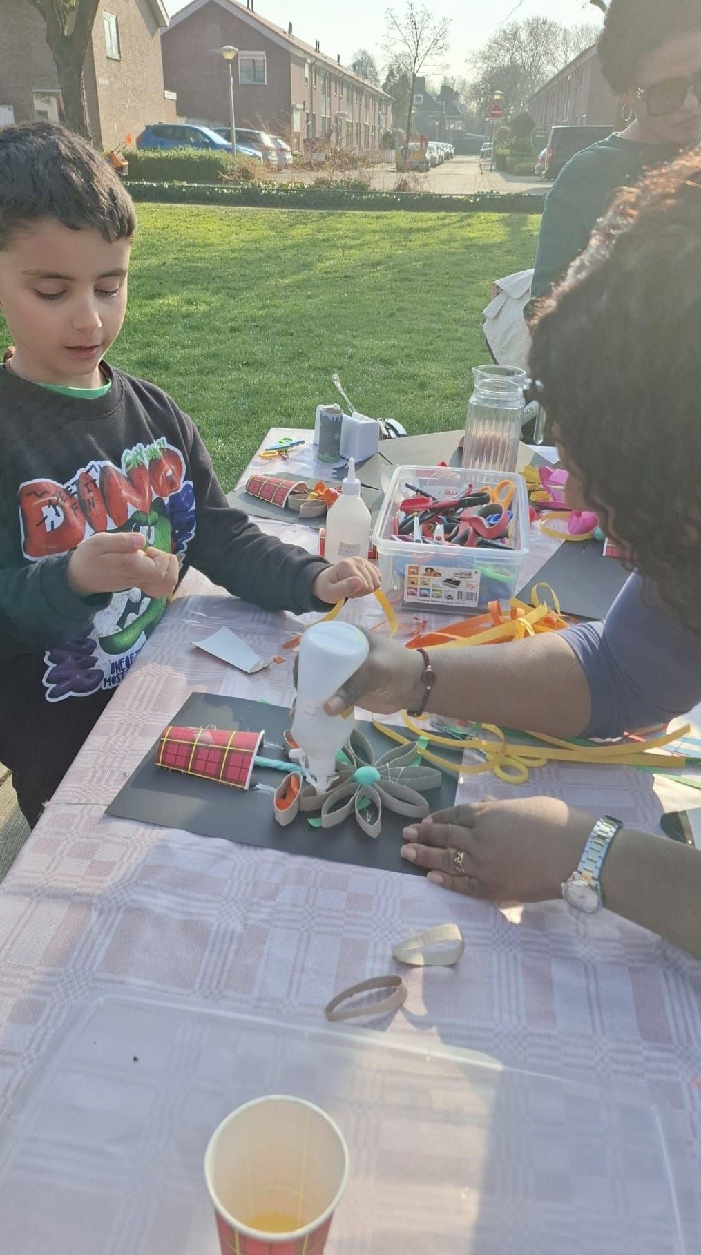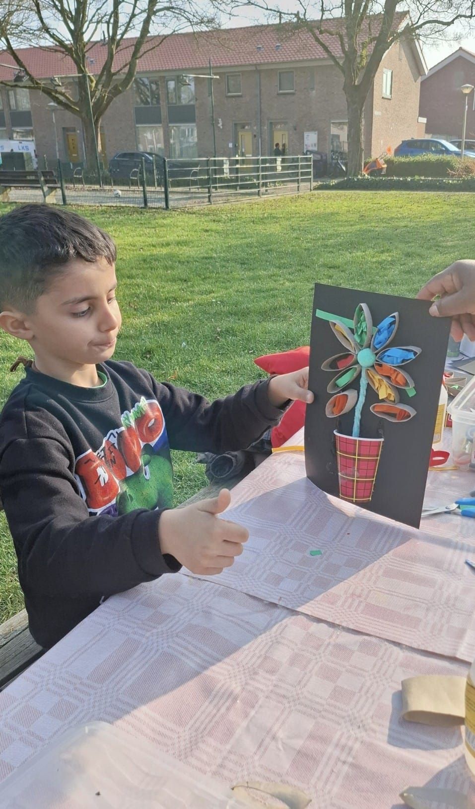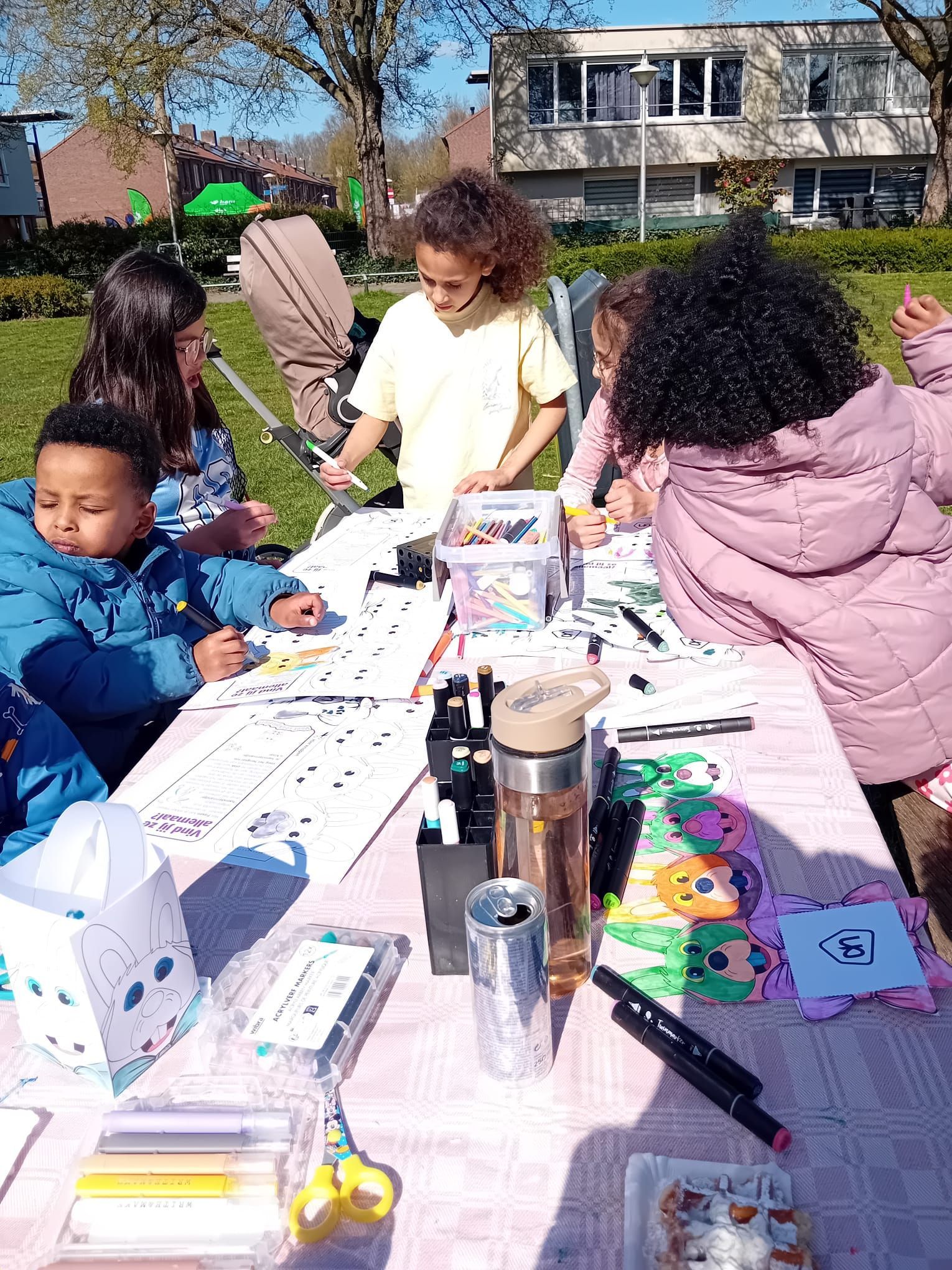2026-04-01: De kinderen zijn weer volop bezig met knutselen. Bij het mooie weer kunnen ze gebruik maken van het veld voor de deur van het Praathuis. Door het Woonbedrijf worden ze getrakteerd op wafels, poffertjes, frisdank en water.