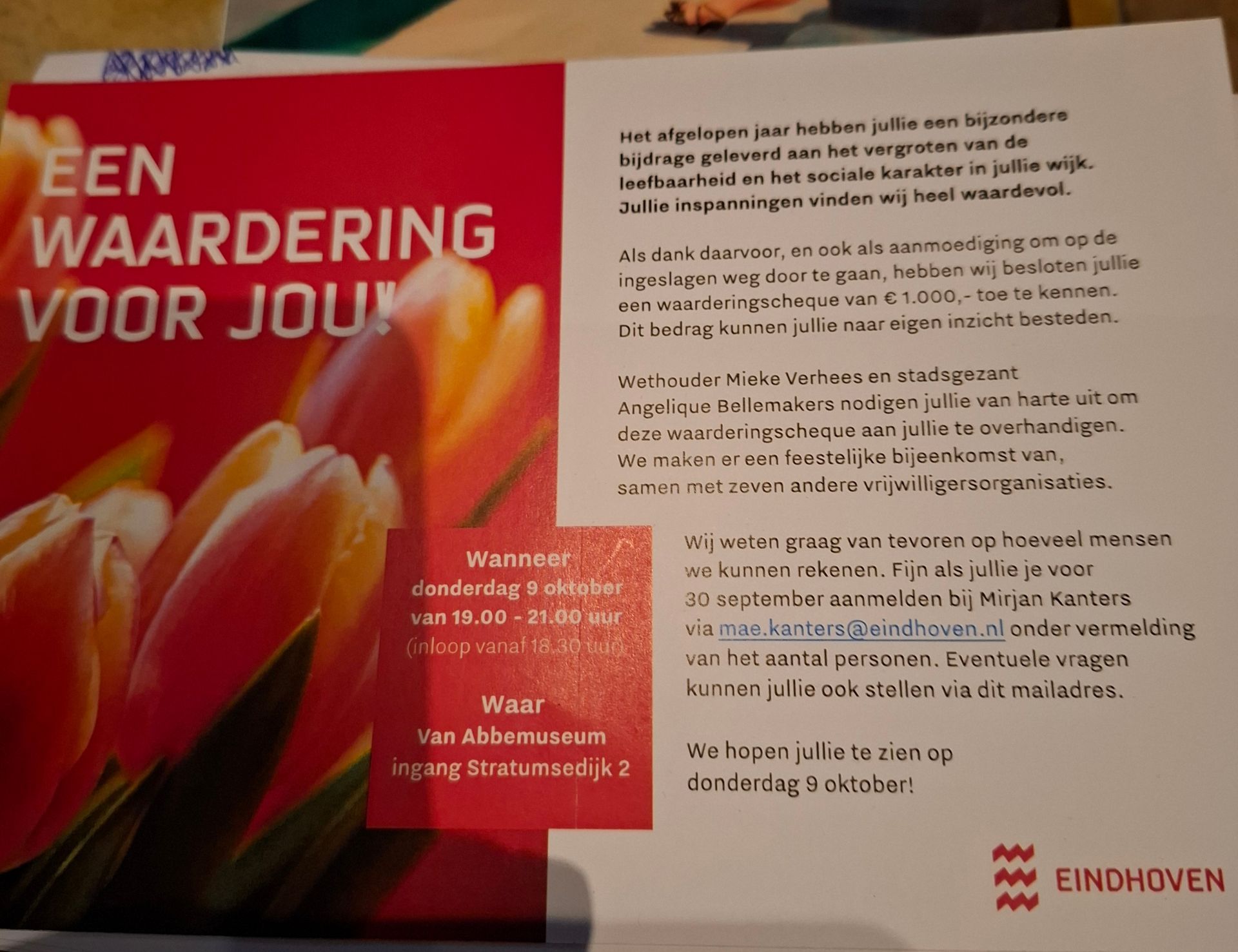 Het bestuur en de vrijwilligers werden door Gemeente Eindhoven verrast met een waarderingscheque voor hun enorme, jarenlange inzet voor de buurt.