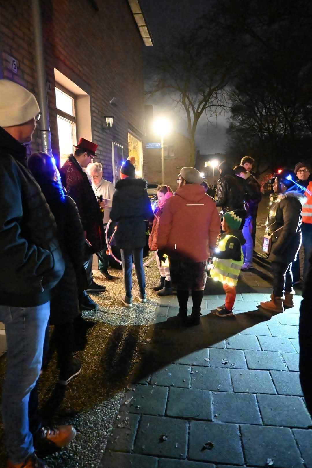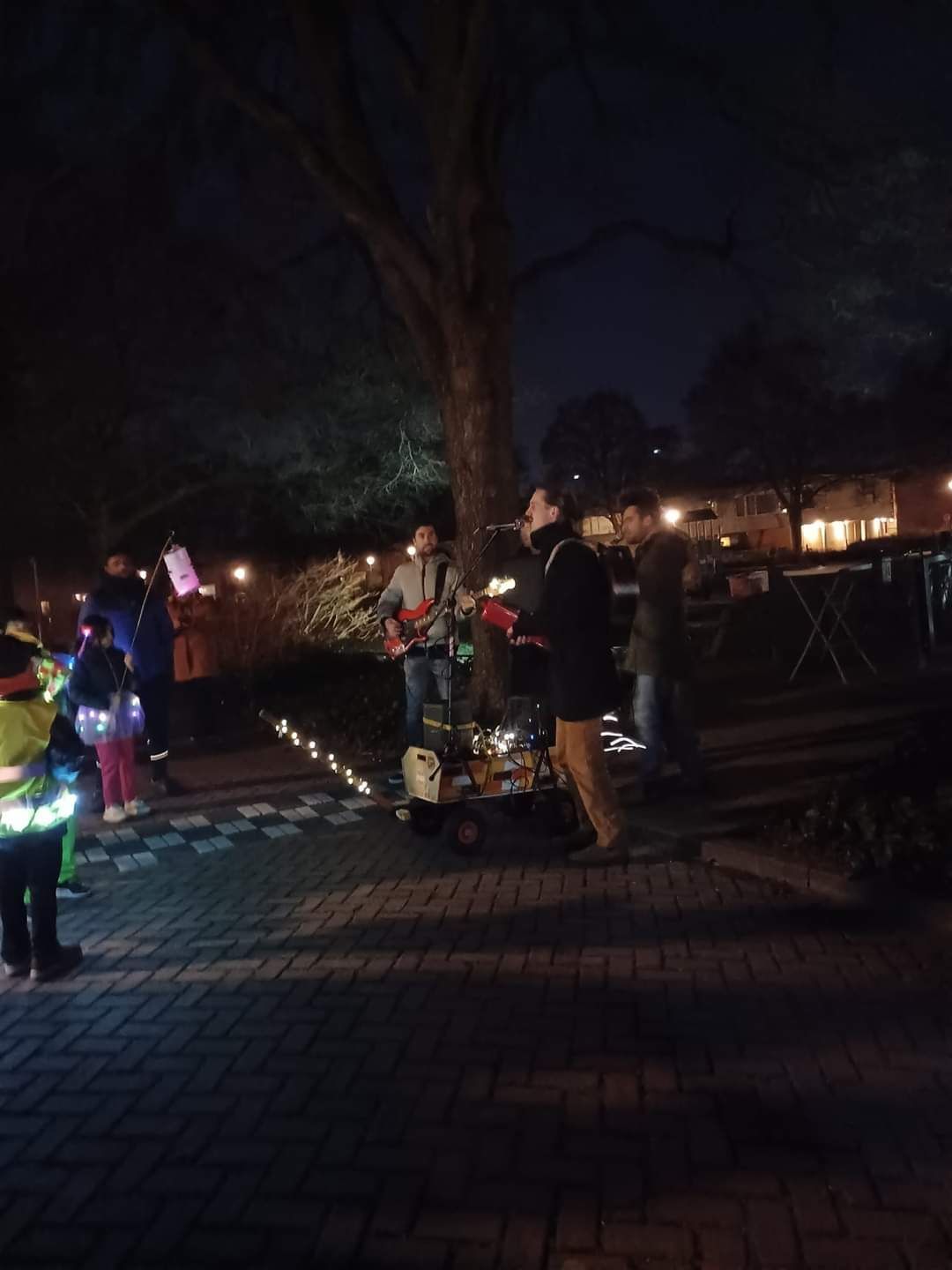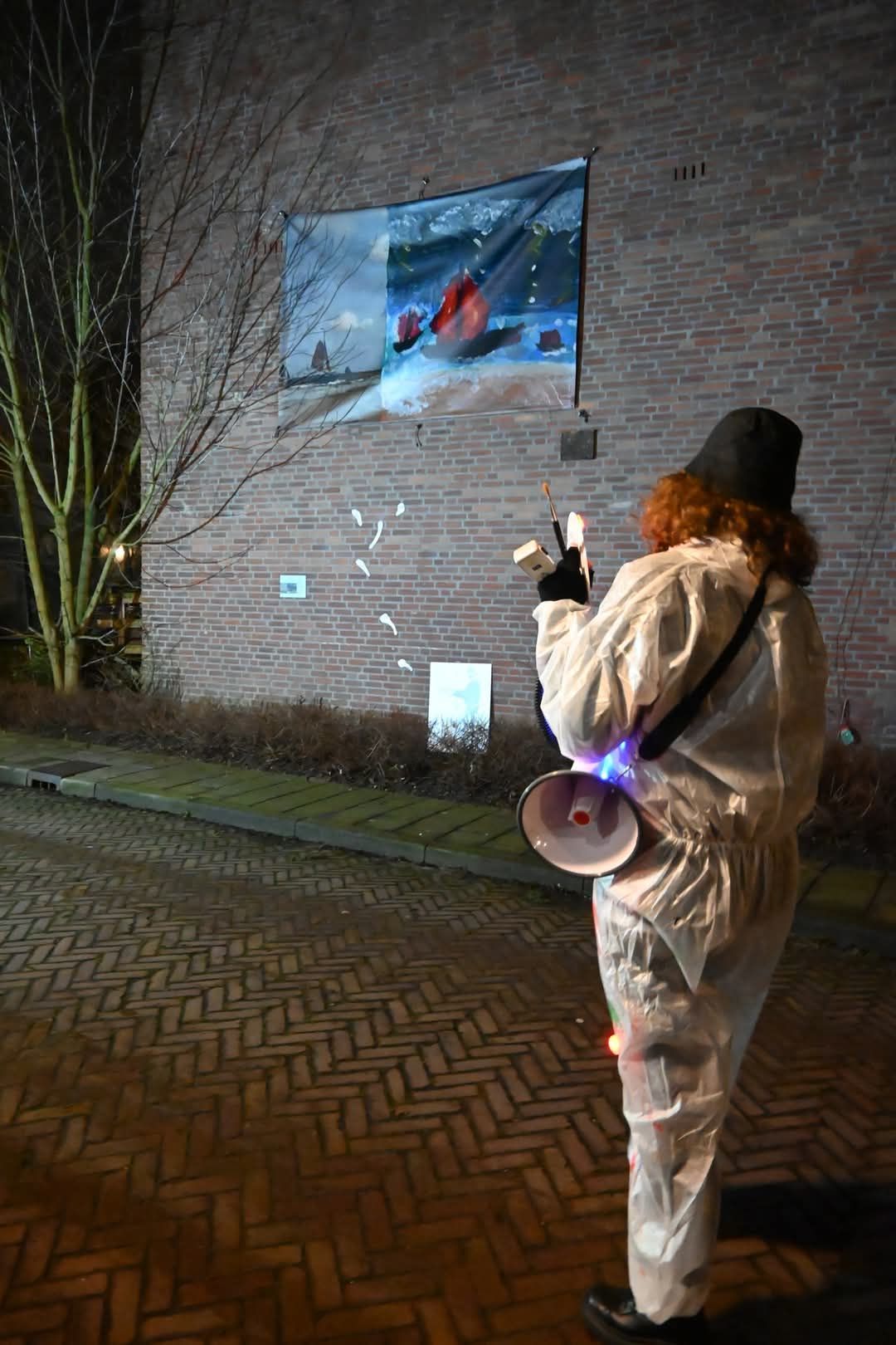 Een kleine tocht met de versierde fietsen en lichtobjecten door de buurt o.b.v. muziek en een vuurspuwer. Ook werden een aantal van de nieuwe geveldoeken bekeken (zie fotoboek "Geveldoeken").
